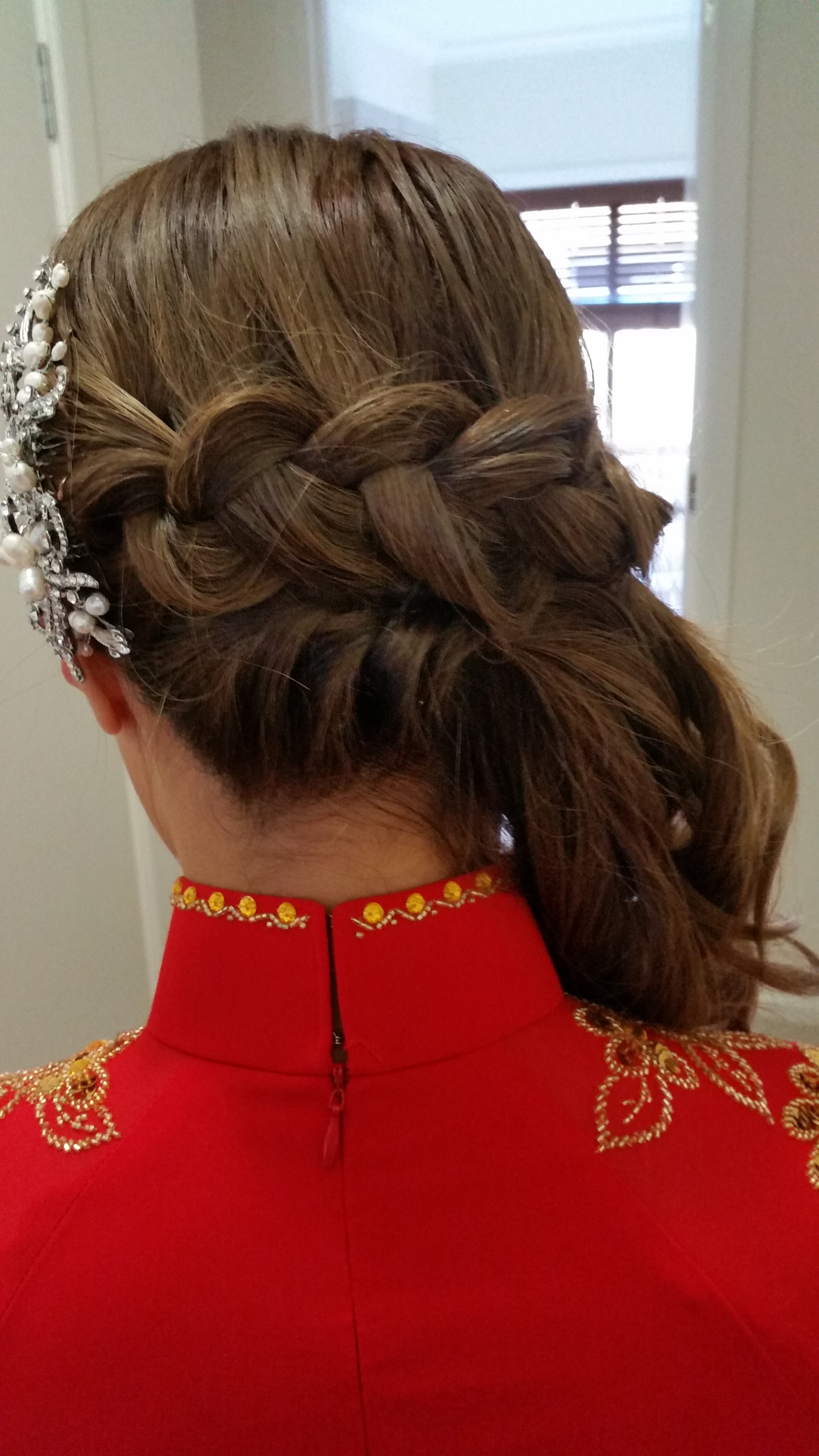 Congratulations to today’s bride Ava! Ava is super relaxed and such a bubbly girl…makes my job so enjoyable! After getting her hair and makeup done, she even had time to do makeup for one of her friend! How sweet is that! Her hairstyle is a waterfall braid with curls swept to one side. I’m finding the waterfall braids have been very popular recently. Her makeup is smokey eyes with two pairs of lashes.